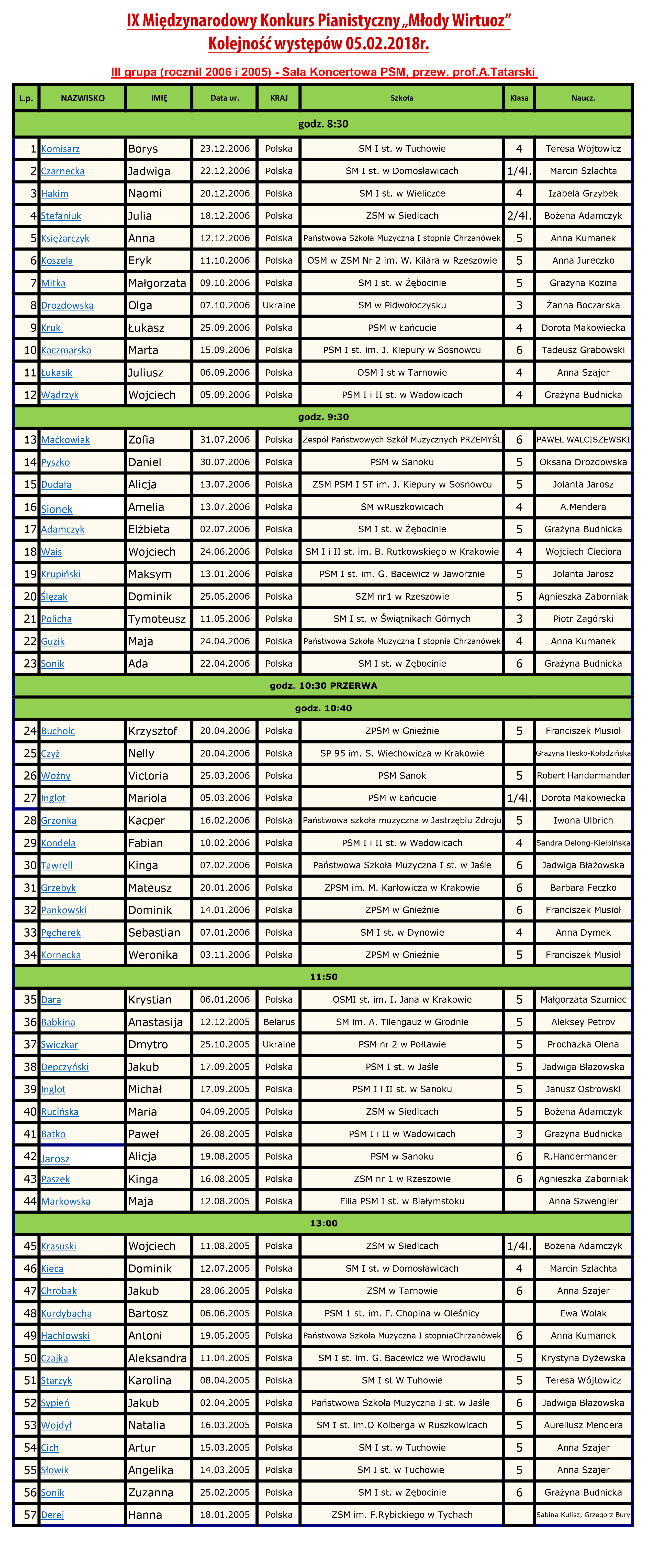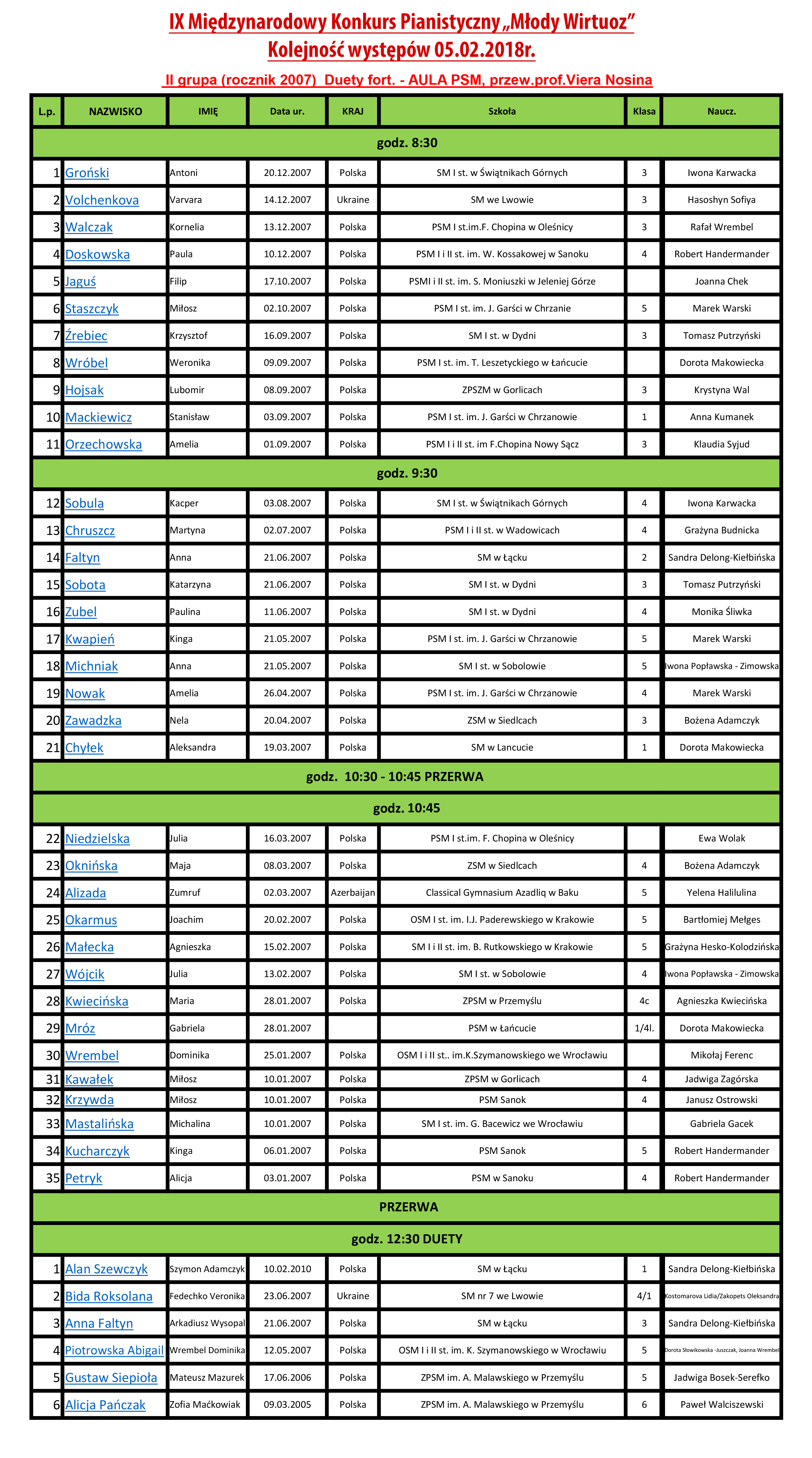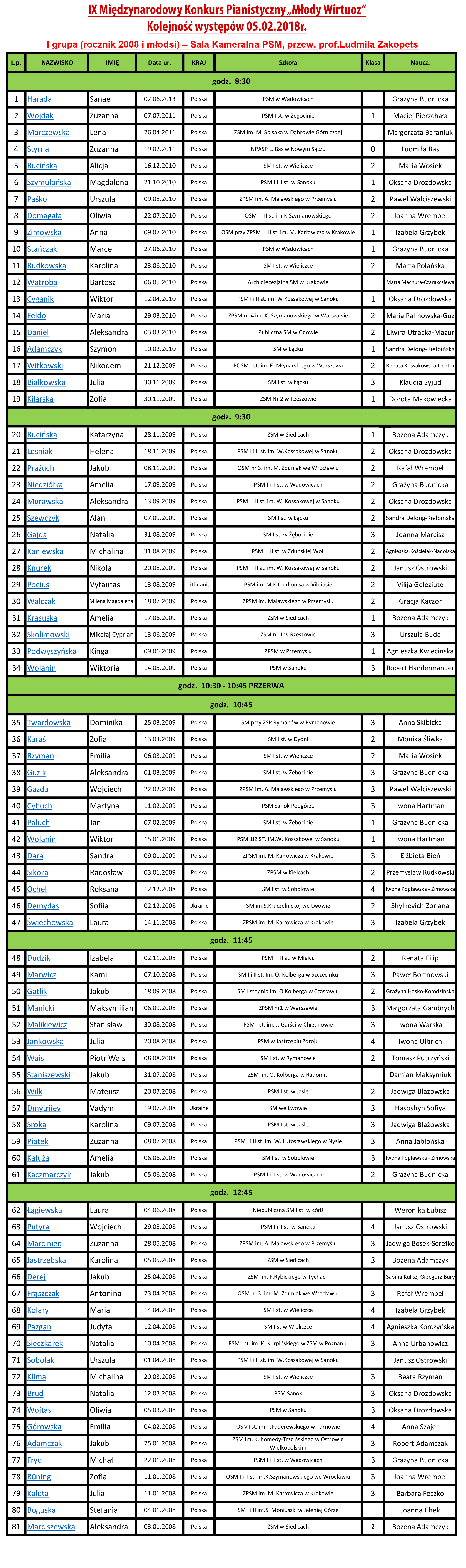 Drodzy uczestnicy, opiekunowie oraz rodzice zainteresowani IX Międzynarodowym Konkursem Pianistycznym "Młody Wirtuoz". Zapraszamy do zapoznania się z listą przesłuchań na tegoroczną edycję. Ze względu na mnogość zgłoszeń, w tym roku dokonaliśmy podziału na 3 grupy.